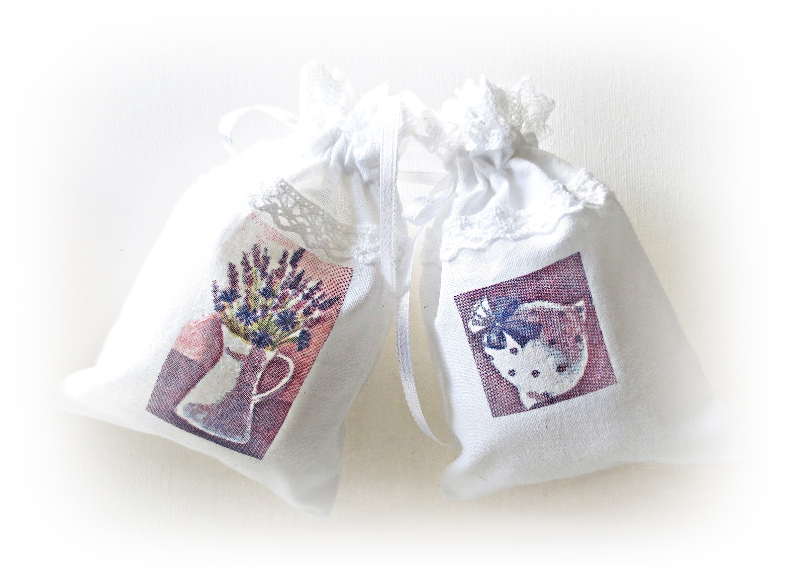 Dom här söta påsarna har jag sytt i vitt bomullstyg, dekorerat dom med vitvirkad bomulls spets och en bild på lavendel från en servett.